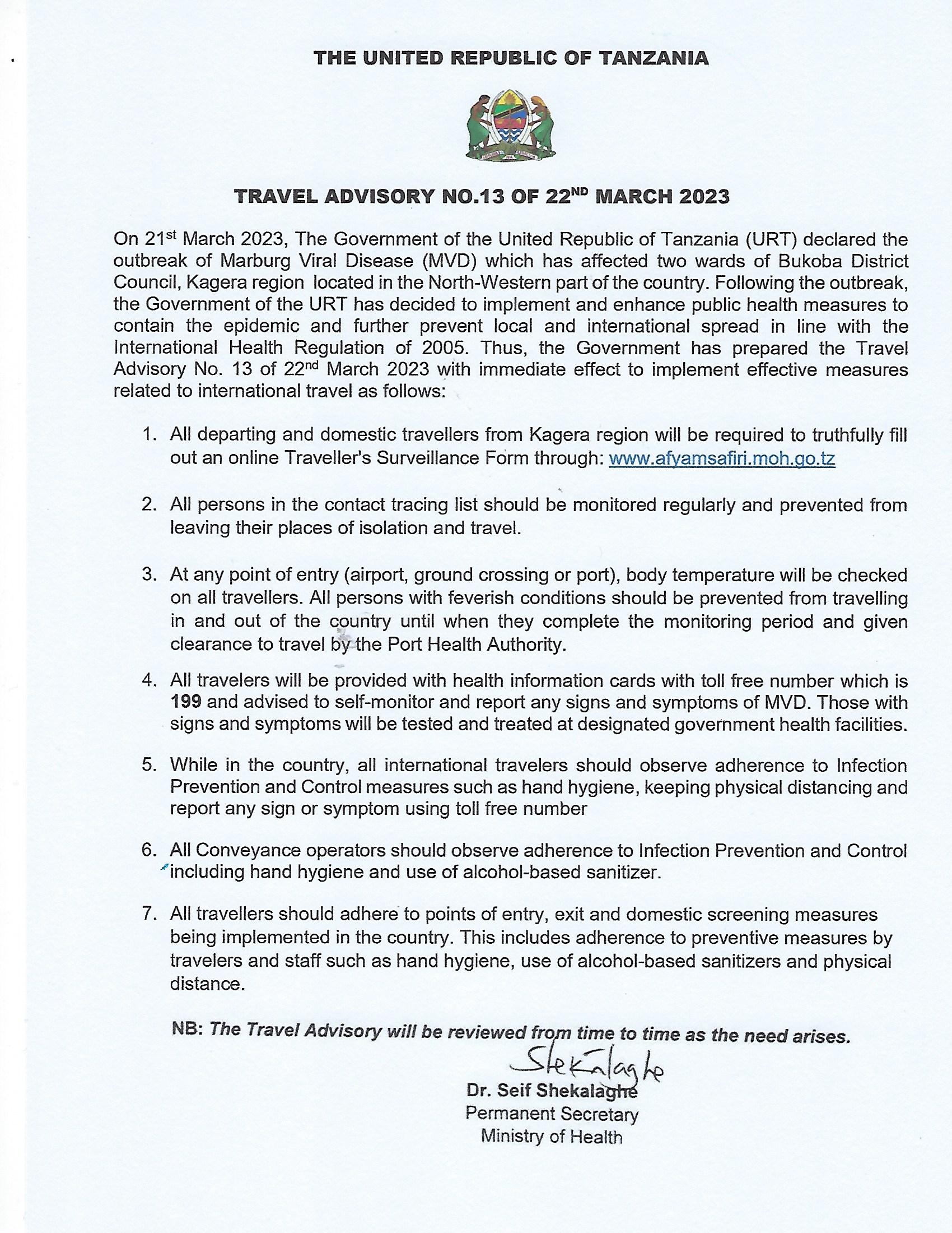 TRAVEL ADVISORY NO.13 OF 22ND MARCH 2023