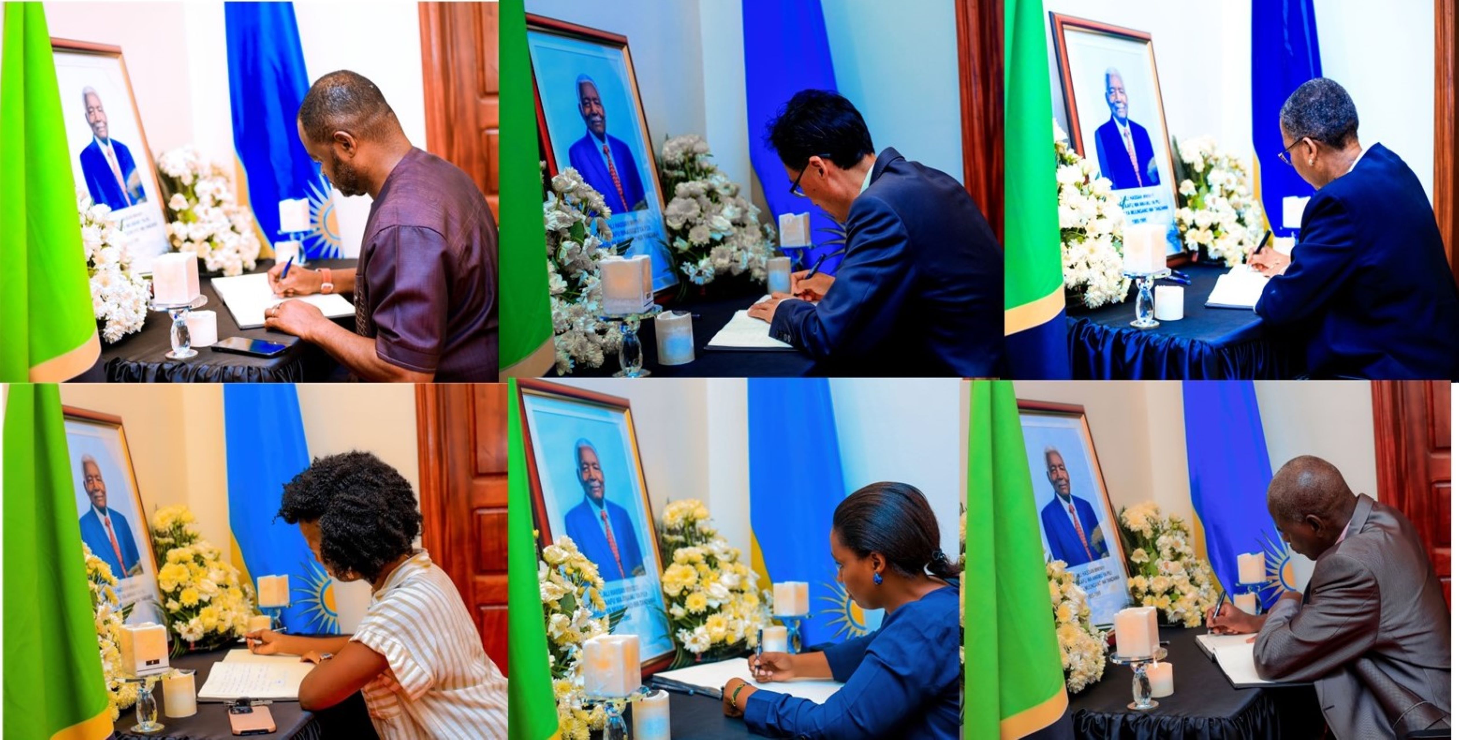 Kufuatia Kifo cha Mhe. Ali Hassan Mwinyi, Rais Mstaafu wa Awamu ya pili wa Jamhuri ya Muungano wa Tanzania kilichotokea tarehe 29 Februari, 2024, Wageni mbalimbali wakiwemo Mabalozi wanaoziwakilisha nchi zao nchini Rwanda na Diaspora wameendelea kujitokeza kutoa salamu zao za pole kwa Serikali na Watanzania kwa ujumla tarehe 6 Machi, 2024.
